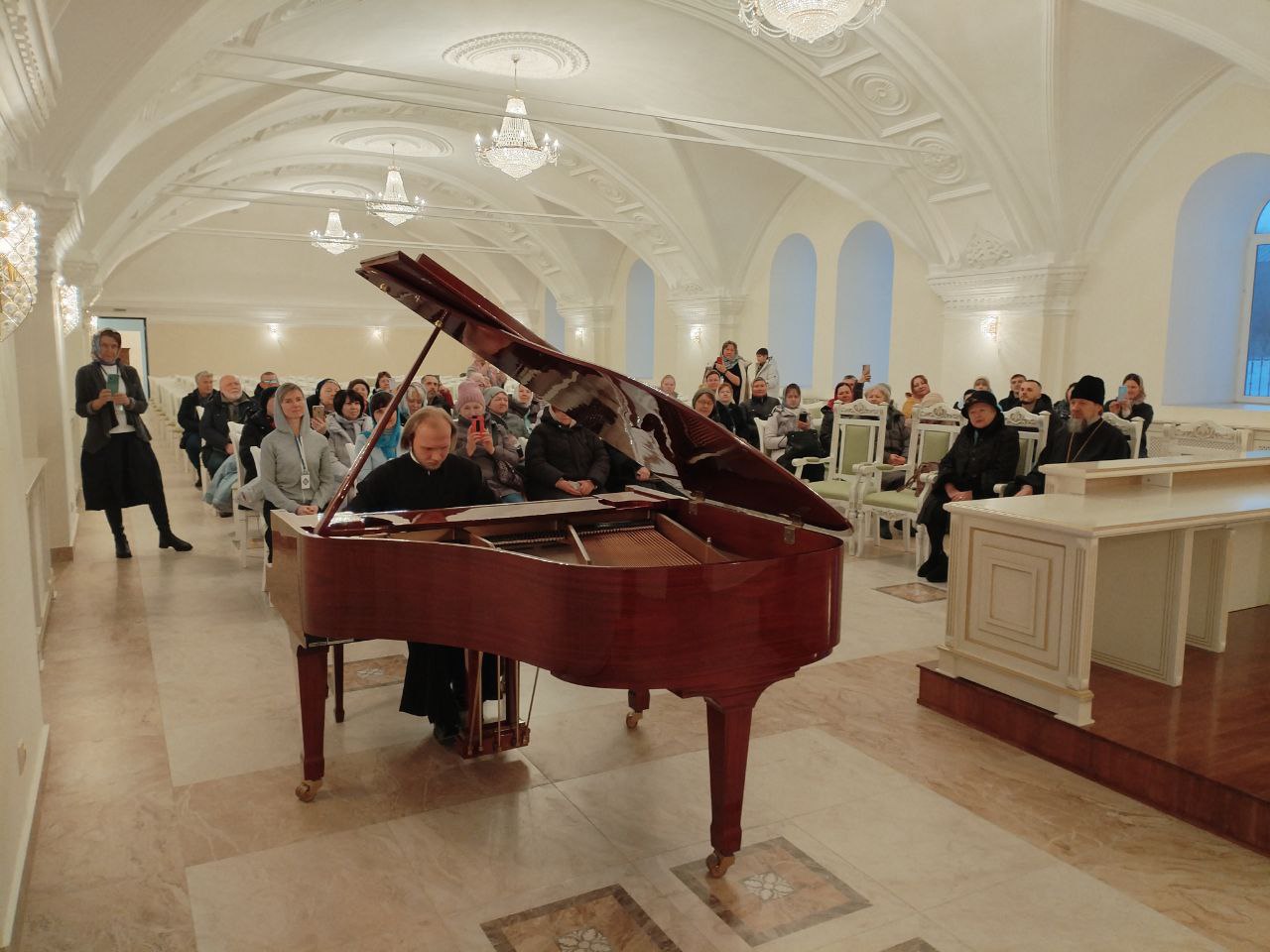 Наша паломническая программа должна была закончиться посещением кафедрального собора в Краснослободске и вечерней молитвой. Но гостеприимный и радушный епископ Климент неожиданно нарушил наши планы, пригласив всю паломническую группу в Епархиальное управление, где нас поджидал масленичный сюрприз: талантливый и перспективный заведующий епархиальной канцелярией иеродиакон Агафангел исполнил для гостей несколько классических произведений на фортепиано.