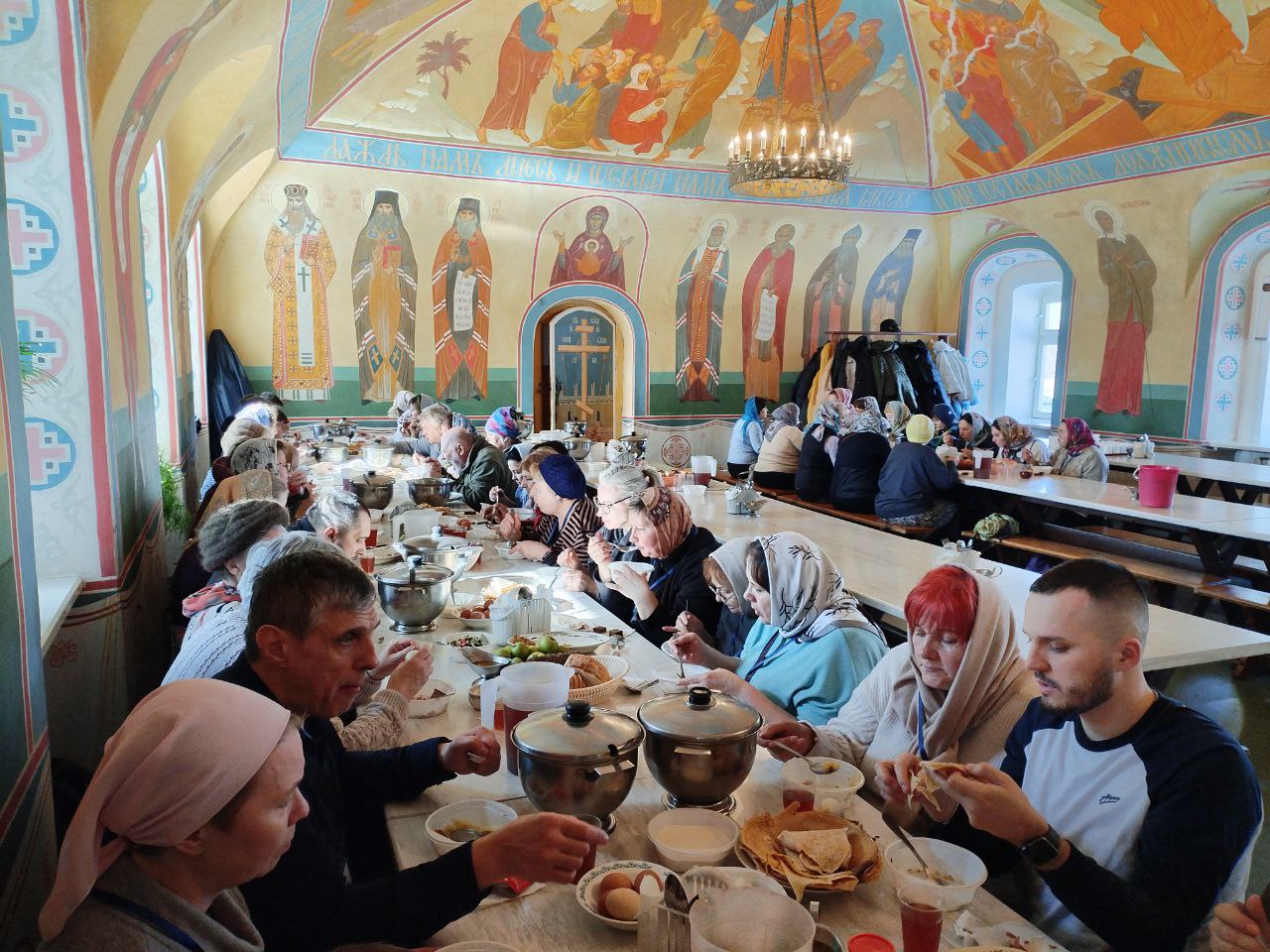 В стенах мужского монастыря паломническую группу ждала масленичная трапеза: блины со сметаной, творог, яйца, сыр… И это не считая первого и второго блюд, фруктов, компота и прочих угощений.
