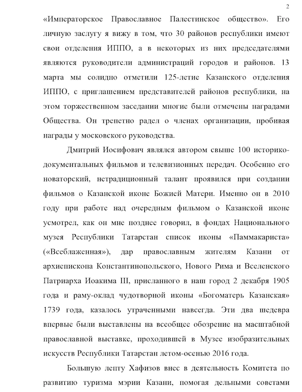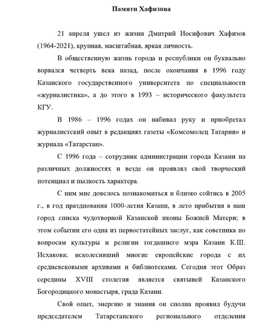 21 апреля 2021 года не стало руководителя Татарстанского отделения Императорского Православного Палестинского Общества, советника мэра Казани по вопросам религии, члена общественной палаты Республики Татарстан Дмитрия Хафизова.