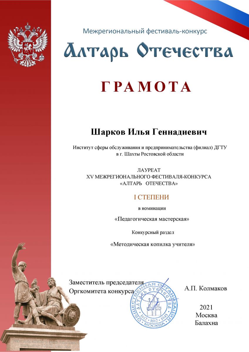 Проект получил диплом лауреата I степени в номинации «Педагогическая мастерская», конкурсный раздел «Методическая копилка учителя». Диплом подписан заместителем председателя оргкомитета фестиваля-конкурса «Алтарь Отечества 2021», председателем Общероссийской общественно-государственной организации ДОСААФ России генерал-полковником А.П. Колмаковым.