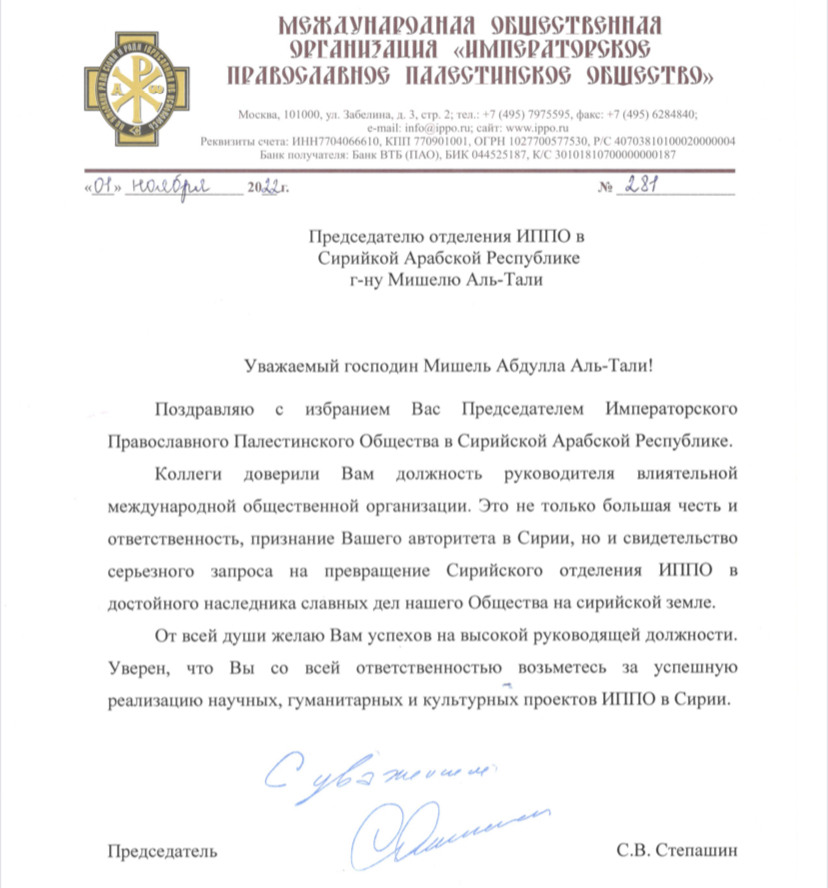 Письмо Председателя ИППО Сергея Степашина в адрес нового руководителя Сирийского отделения Общества Мишеля Аль-Тали