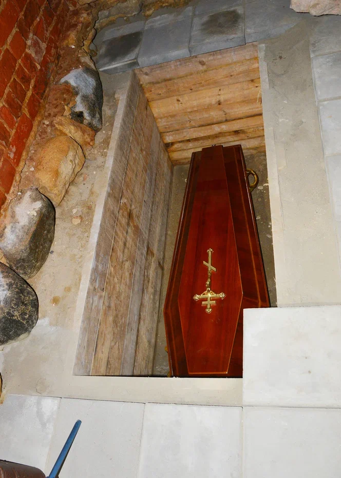 После чего священники отнесли гроб с останками игумена в каменную палатку под северным крыльцом собора, где они были обнаружены год назад, и накрыли могилу плитой, под которой было обнаружено захоронение. Надпись на плите гласит: «Лета 7198 году месяца генваря в день представился раб Божий монах Косма и положен под этим камнем».