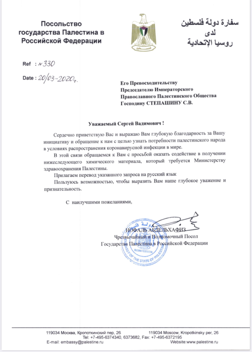 В адрес Председателя ИППО было направлено письмо от Чрезвычайного и Полномочного Посла Государства Палестина в России Нофаля Абдель Хафиз с просьбой об оказании содействия в получении химического материала, который требуется Министерству здравоохранения Палестины.