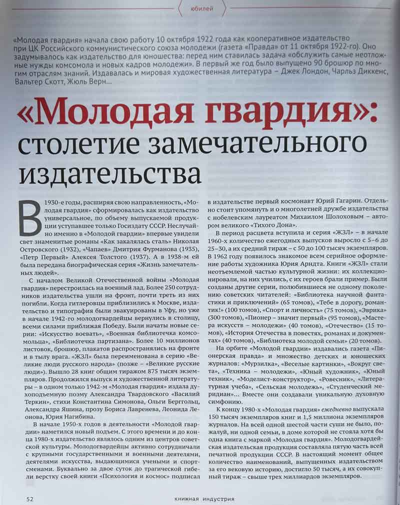В журнале «Книжная индустрия» (№6 (190) была опубликована статья «Молодая гвардия»: столетие замечательного издательства», посвящённая вековому юбилею.