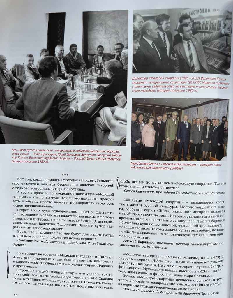 «Как-то даже не верится: «Молодая гвардия» – и 100 лет… А все равно молодая! Я сам был членом ЦК комсомола, и хорошо знаю эти слова: «Мы – молодая гвардия/Рабочих и крестьян…».