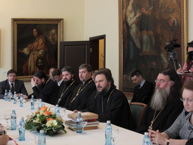 На круглом столе были рассмотрены различные возможности взаимодействия Эрмитажа и Духовной Академии, среди них – более тесные контакты церковных музеев с Эрмитажем, возможность участия хоров Академии в различных эрмитажных мероприятиях.