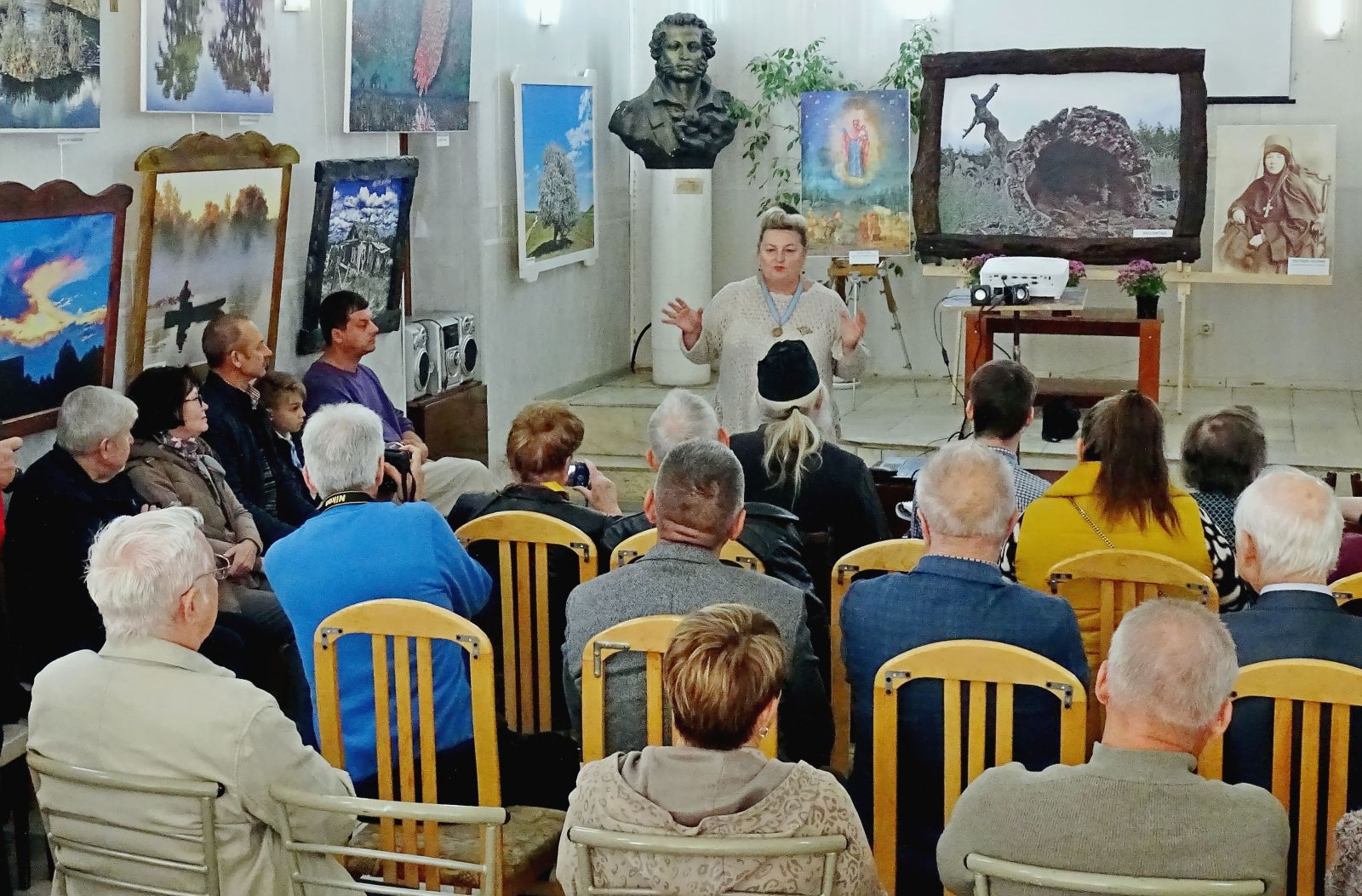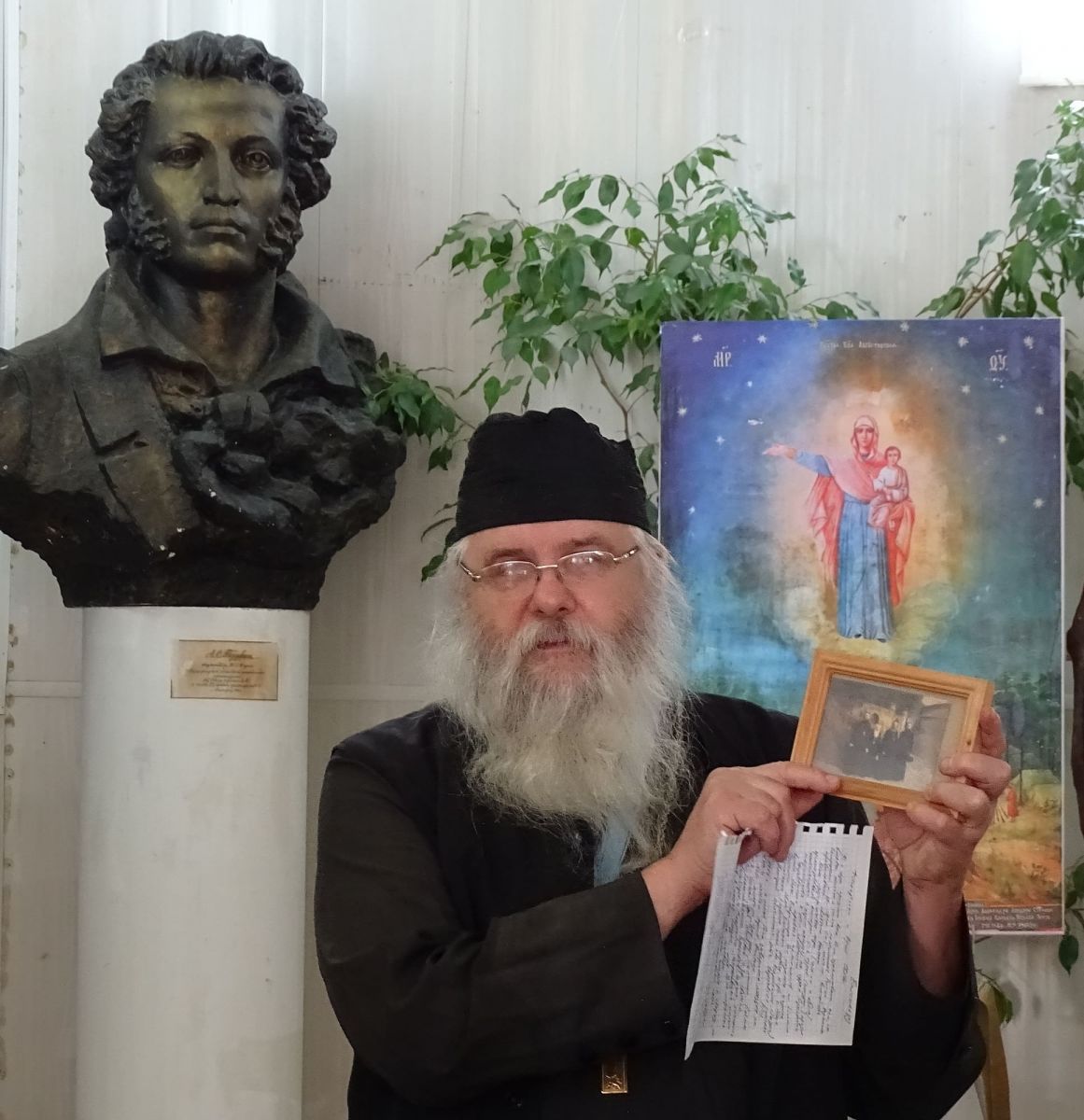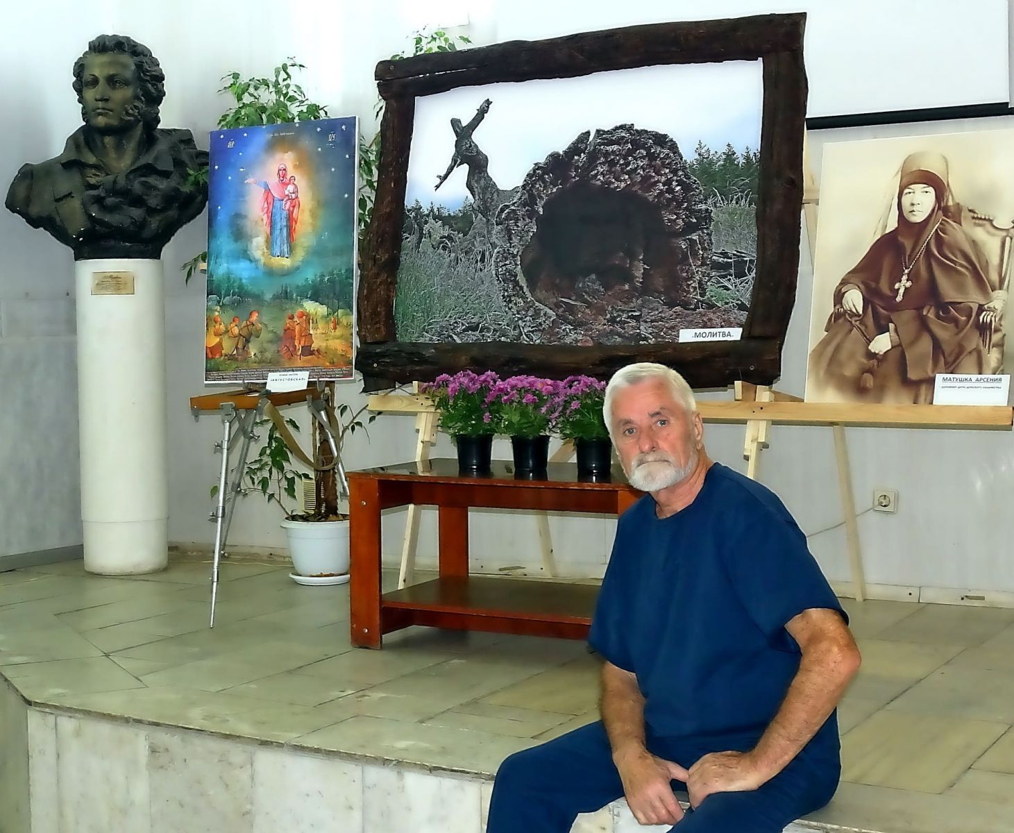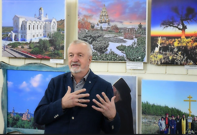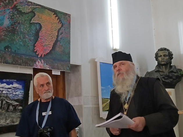 Затем действительный член ИППО иерей Владимир Гаркуша поделился воспоминаниями о своем первом паломничестве в 1996 г. из Одессы к святыням христианского Востока: «Духовником православных паломников был назначен игумен Одесского Свято-Успенского мужского монастыря отец Иона Игнатенко (известный ныне всероссийский старец). Мы посетили Царьград, Салоники, Патмос, Кипр, Синай, Гроб Господень и другие православные святыни. Отец Иона, беседуя с паломниками, рассказывал о силе православного Креста, священнического благословения, о важности покаяния в жизни христиан, о необходимости следования православным традициям веры». Прочитав авторское стихотворение «Отчий край», батюшка благословил открытие выставки.