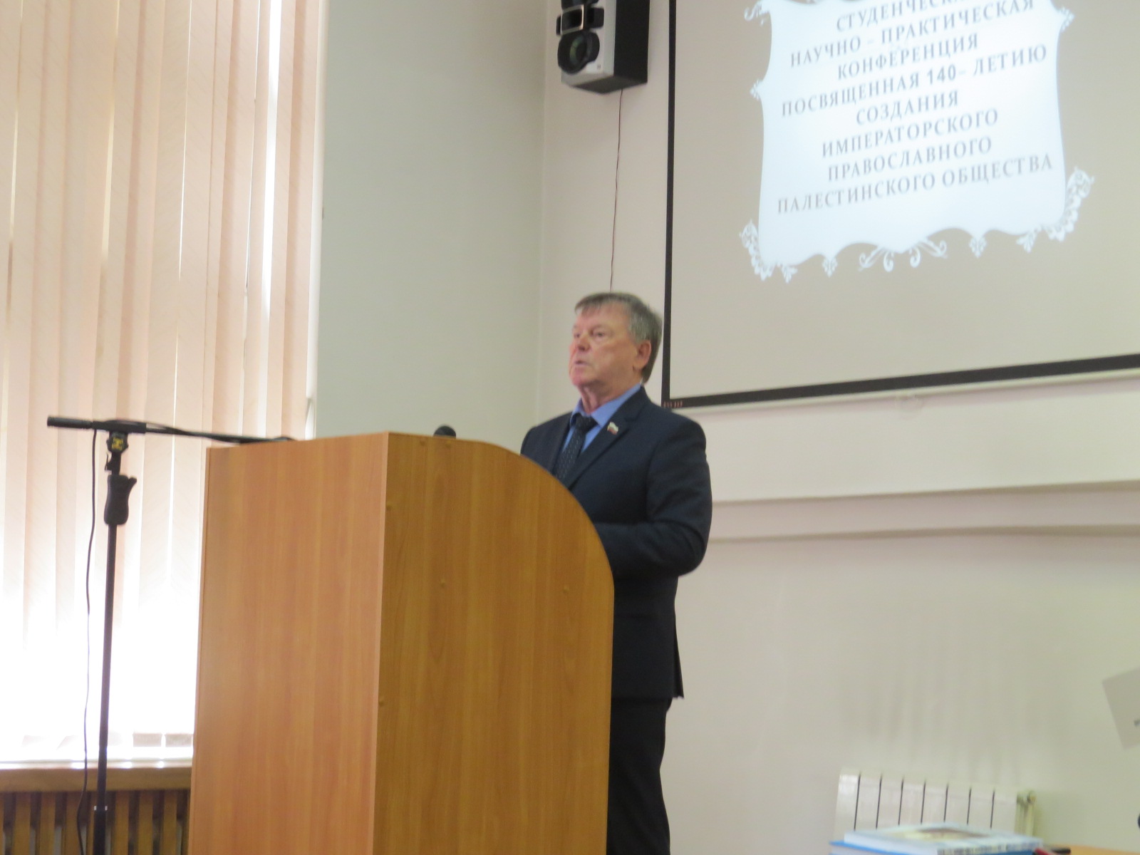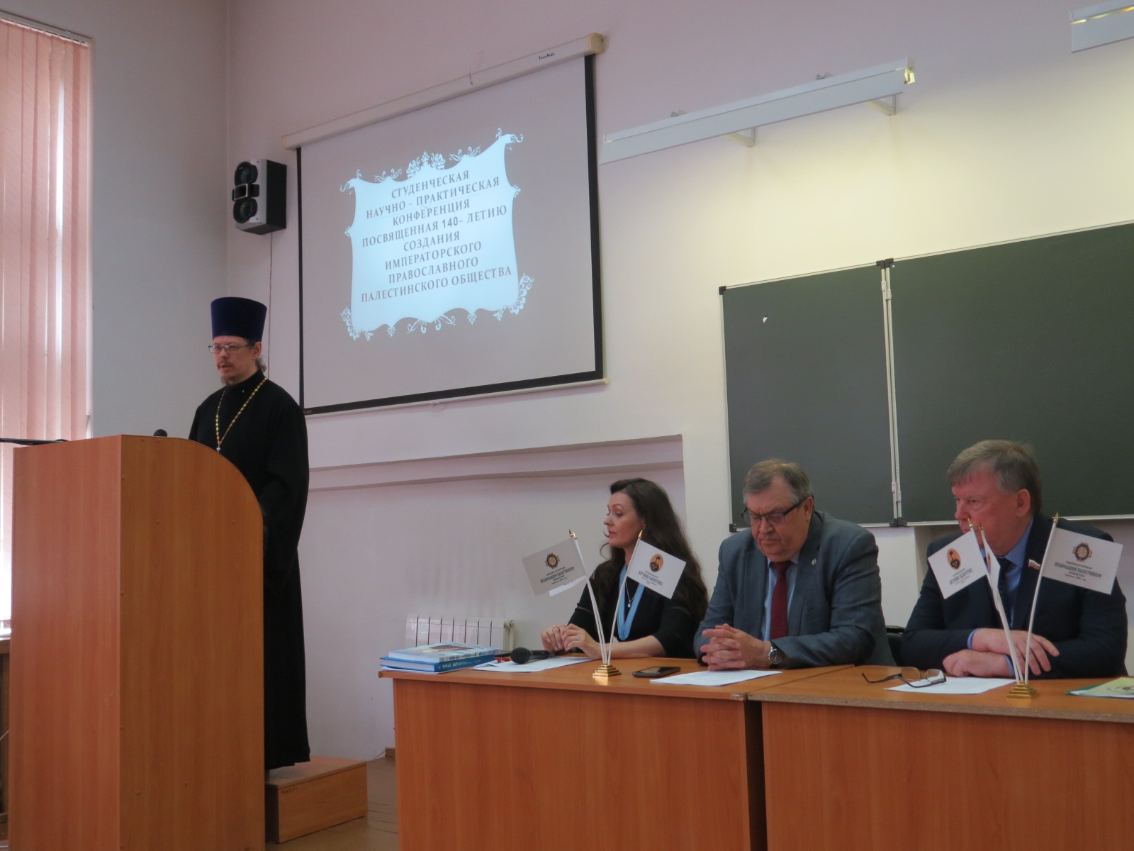 В начале конференции к собравшимся с приветственным словом обратились руководитель регионального отделения ИППО Александр Брюханов, который рассказал о юбилейных датах Императорского Правосланого Палестинского Общества, отметив, что конференция открывает цикл мероприятий, посвященных 140-летию создания ИППО, 205-летию со дня рождения выдающегося земляка, уроженца села Батурино, создателя Русской Палетины архимандрита Антонина (Капустина), 175-летия образования Русской Духовной Миссии в Иерусалиме и 165-летия со дня рождения первого Председателя ИППО Сергия Александровича.