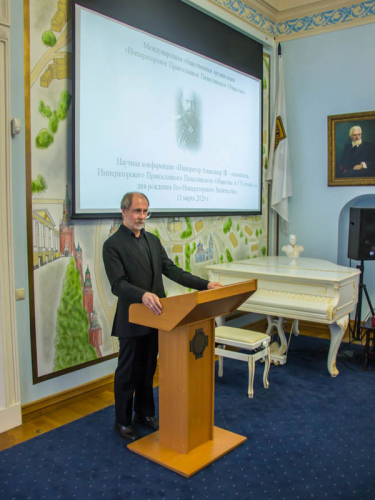 Сергей Вадимович отметил, что Император Александр III вошёл в историю как Царь-Миротворец – в годы его правления Россия не участвовала ни в одном серьёзном военно-политическом конфликте. Он внёс существенный вклад в переустройство системы государственных и общественных отношений в России. Для экономики страны тех лет был характерен экономический рост, что во многом было связано с государственной политикой последовательного покровительства отечественной промышленности. Страна перевооружила армию и флот, стала крупнейшим в мире экспортёром сельскохозяйственной продукции. С именем Императора связан расцвет национального искусства и культуры. Иными словами, реалистичная и бескомпромиссная внутренняя и внешняя политика Императора Александра III за короткий исторический срок вывела Российскую державу на передовые позиции в Европе и мире. Опыт тех лет бесценен и для нашего времени.