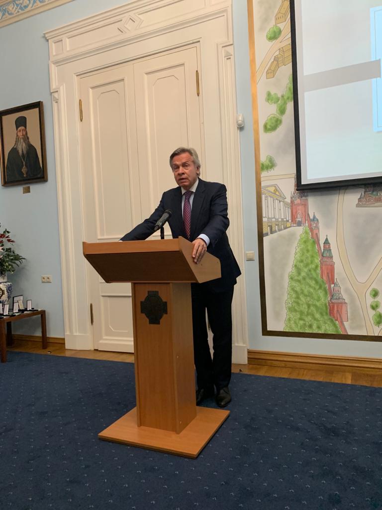 Затем выступил действительный член ИППО, член Совета Федерации Федерального собрания Российской Федерации, председатель временной комиссии Совета Федерации по информационной политике и взаимодействию со средствами массовой информации Алексей Пушков. Он отметил, что ИППО находится в центре сложных процессов, которые не сегодня начались и закончатся не завтра. Алексей Пушков акцентировал внимание на теме защиты христиан, о которой говорил Председатель ИППО в своём докладе. Член ИППО выступил с предложением о сотрудничестве с организациями, которые занимаются защитой и поддержкой традиционных христианских ценностей в Европе.