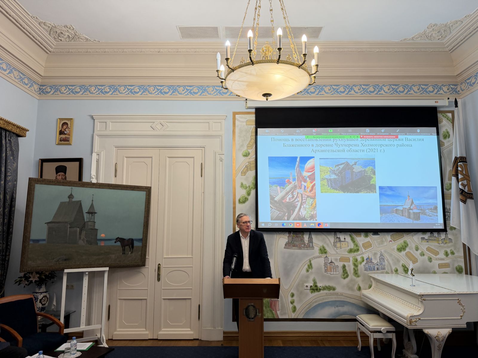 Также прозвучало выступление руководителя Архангельского отделения ИППО Владимира Станулевича. Владимир Игоревич акцентировал внимание участников заседания на ключевых проектах регионального отделения Общества. А также рассказал о ходе работ по сохранению деревянного храмового зодчества.