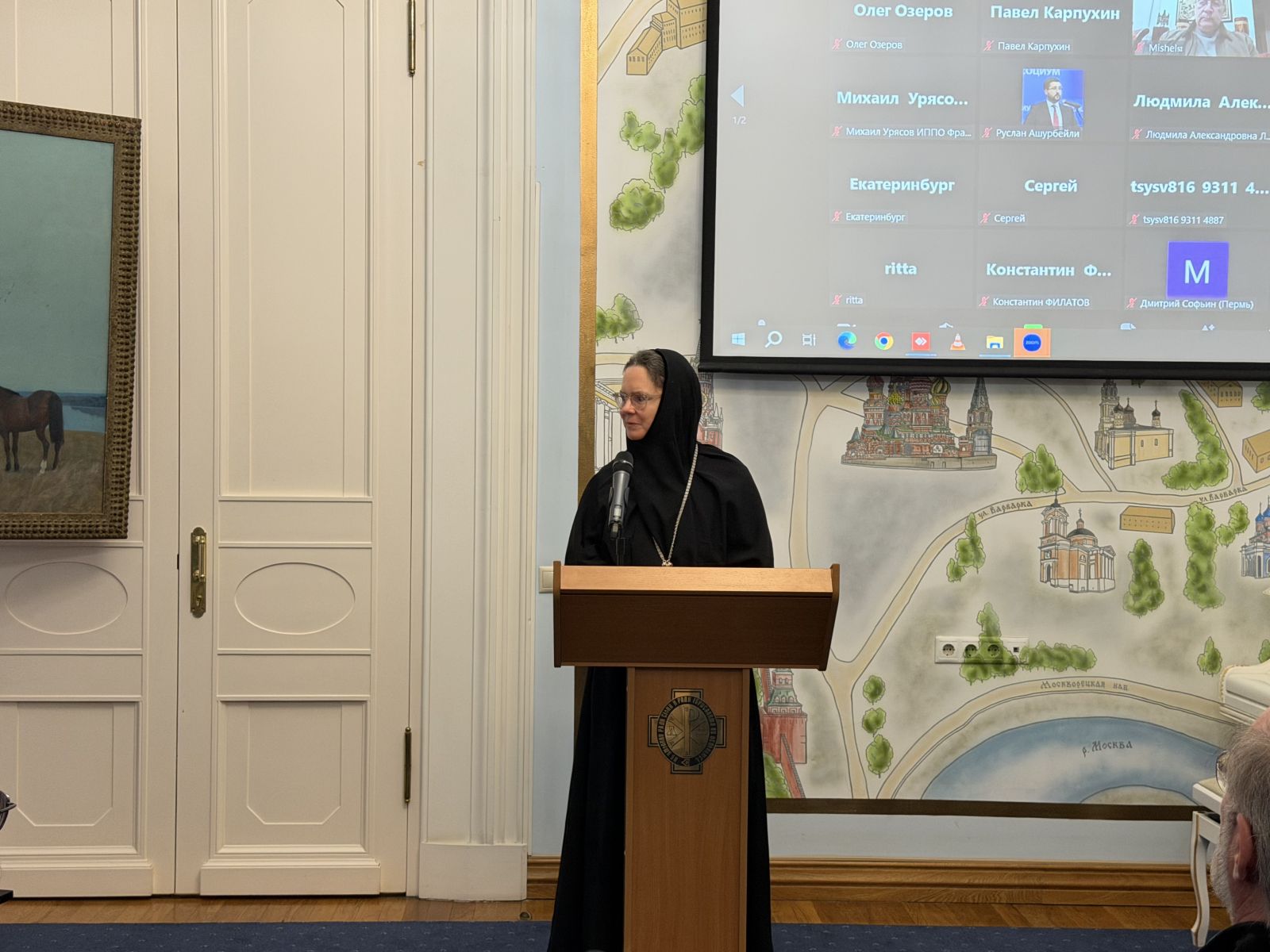 О реализации совместного проекта «Образовательный комплекс Алексеевского ставропигиального женского монастыря г. Москвы и Императорского Православного Палестинского Общества» в своём докладе рассказала настоятельница Алексеевского ставропигиального женского монастыря, руководительница Правового управления Московской Патриархии игумения Ксения (Чернега). Также матушка Ксения выразила благодарность Сергею Степашину за всестороннюю поддержку, в частности, касающуюся законотворческих инициатив по защите прав священников, находящихся в зоне специальной военной операции.