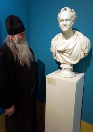 Архимандрит Тихон и Александр Николаевич Панин внимательно ознакомились с выставкой, получив возможность представить основные события правления этого Императора.