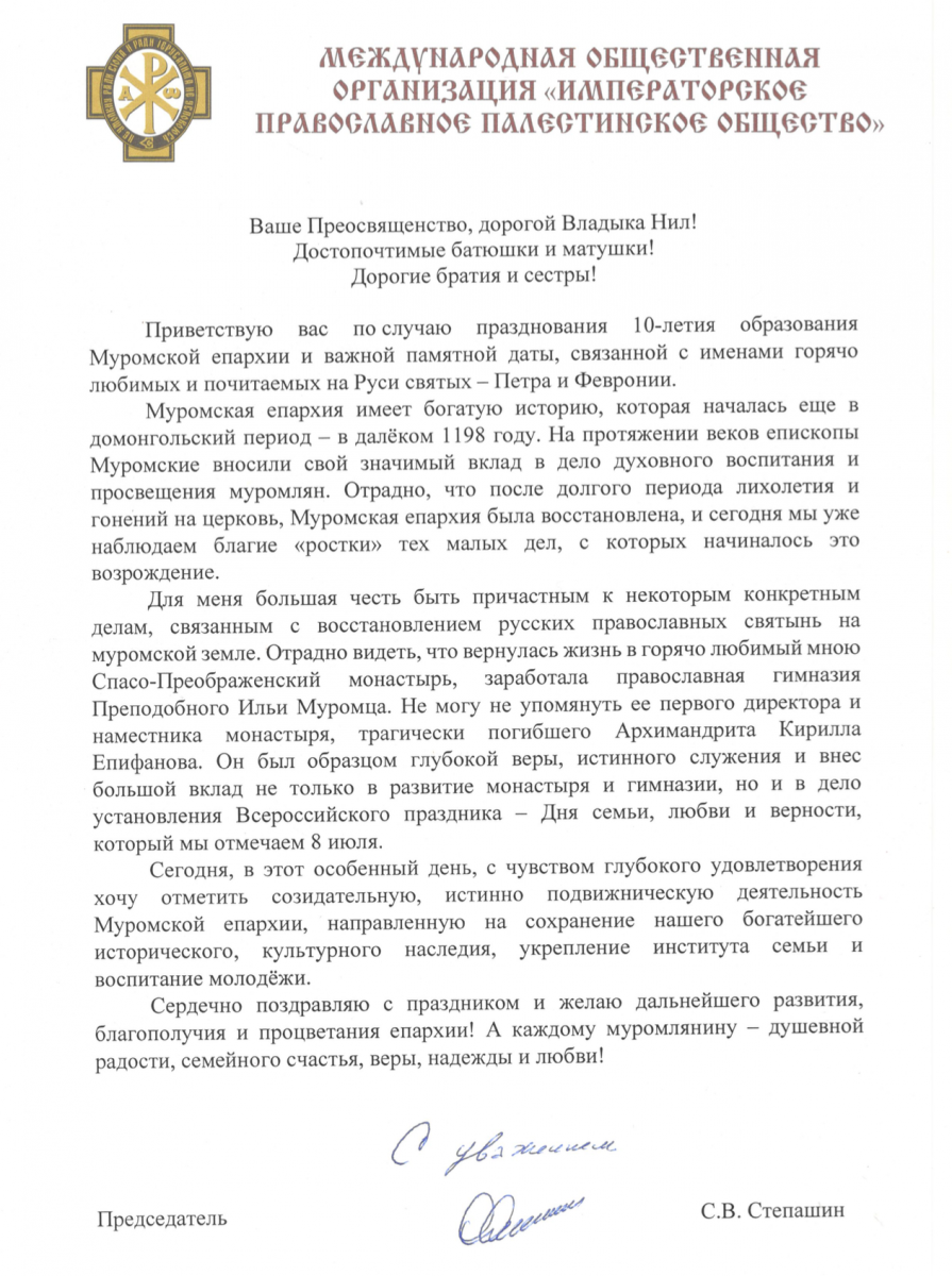 Поздравительное письмо Председателя ИППО Сергея Степашина по случаю 10-летия со дня образования Муромской епархии