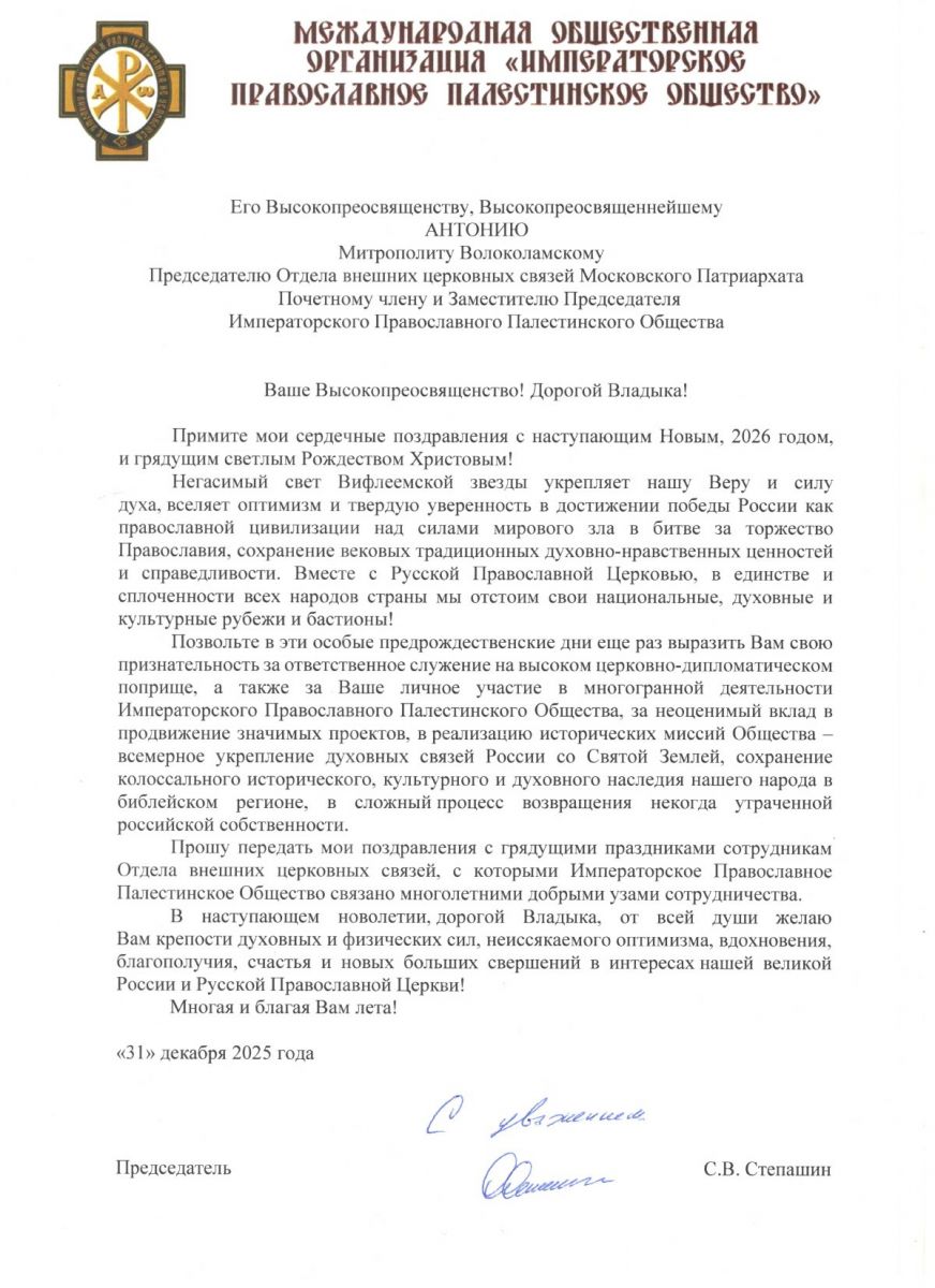 Председатель Императорского Православного Палестинского Общества Сергей Степашин направил поздравление в адрес председателя Отдела внешних церковных связей (ОВЦС) Московского патриархата, постоянного члена Священного Синода Русской Православной Церкви, заместителя Председателя ИППО митрополита Волоколамского Антония по случаю наступающего Нового года и грядущего Рождества Христова.