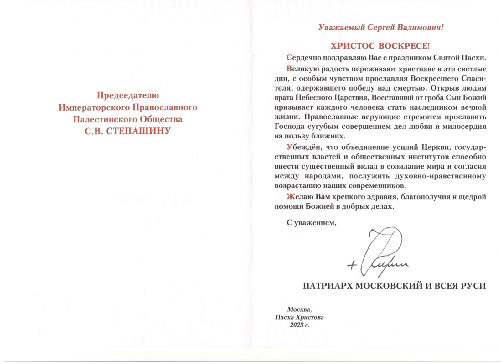 Председатель Комитета Почётных членов ИППО Патриарх Московский и всея Руси Кирилл направил поздравление со Светлым Христовым Воскресеньем в адрес Председателя Императорского Православного Палестинского Общества Сергея Степашина.