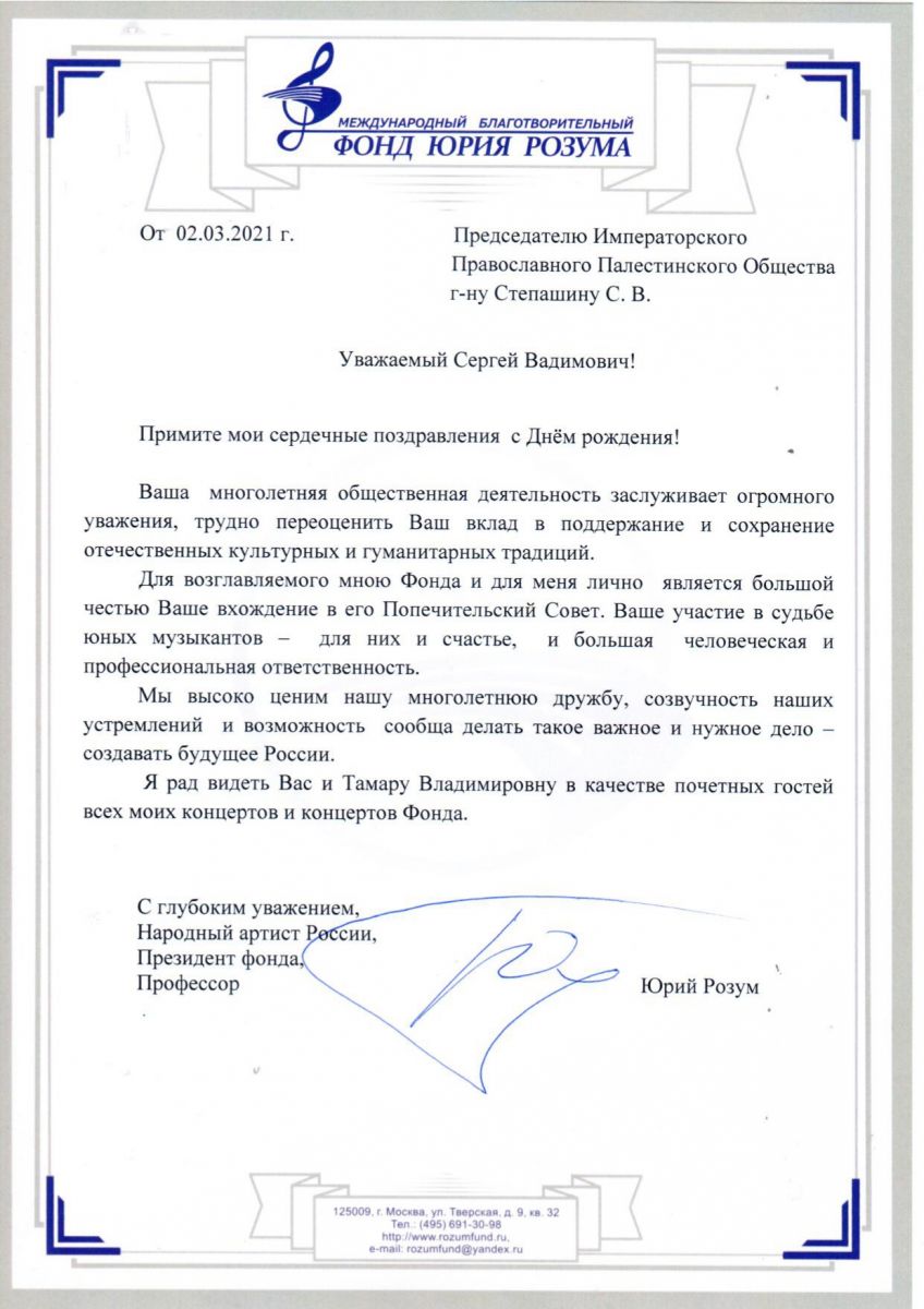 От Президента международного благотворительного Фонда Юрия Розум