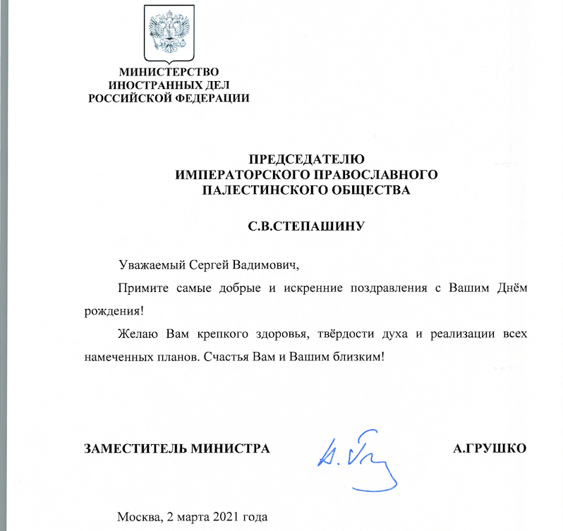 От Заместителя министра иностранных дел Российской Федерации