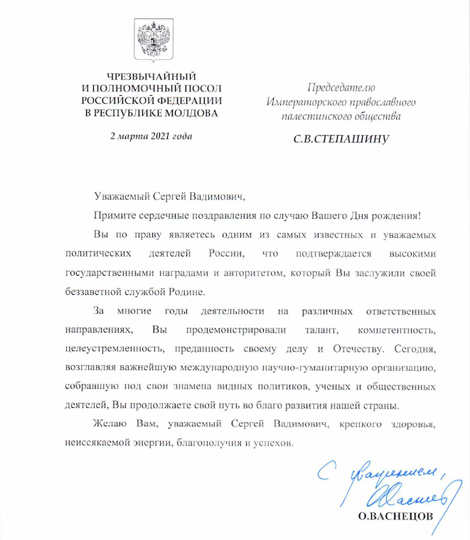 От Чрезвычайного и Полномочного Посла Российской Федерации в Республике Молдова
