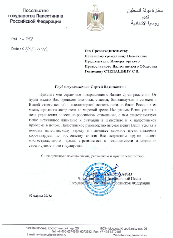 От Чрезвычайного и Полномочного Посла Государства Палестина в Российской Федерации
