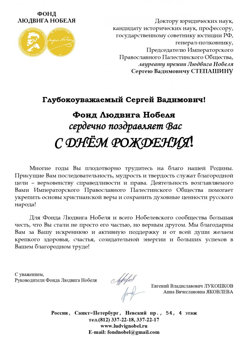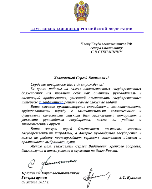 Поздравления с днём рождения в адрес Сергея Степашина