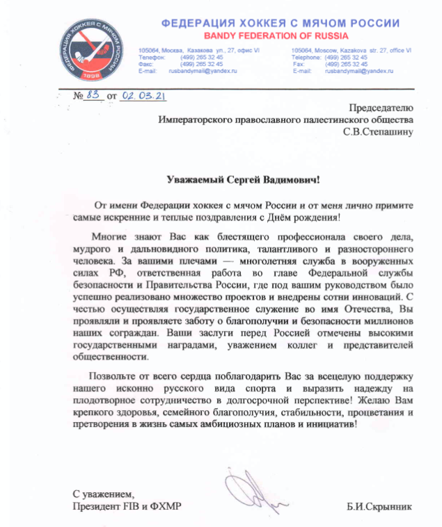 От Президента FIB и Федерации хоккея с мячом России