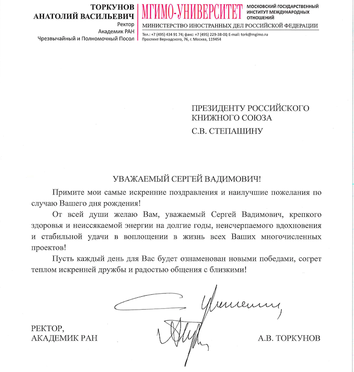 от ректора МГИМО Анатолия Васильевича Торкунова