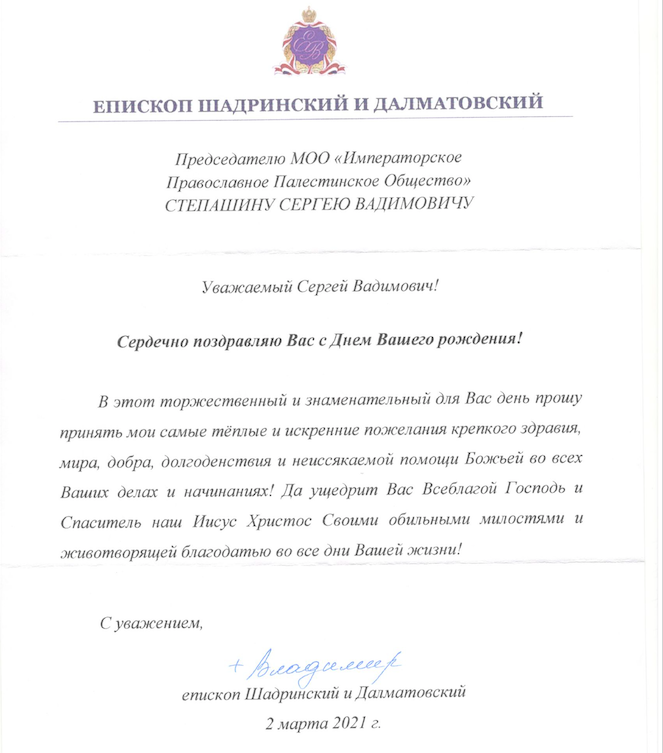 от епископа Шадринского и Далматовского Владимира