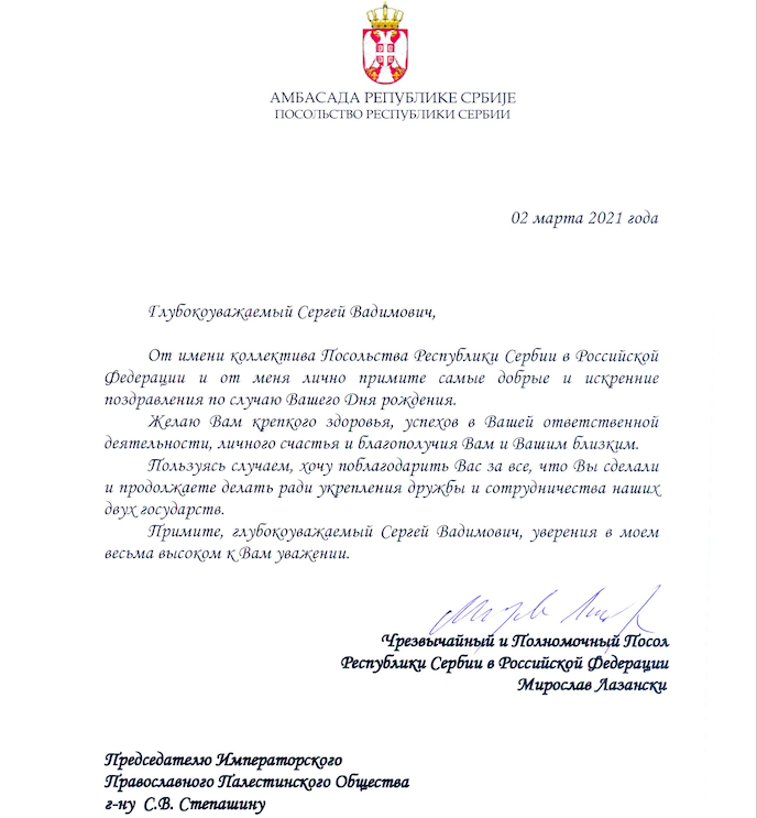 от Чрезвычайного и Полномочного Посла Республики Сербии в Российской Федерации