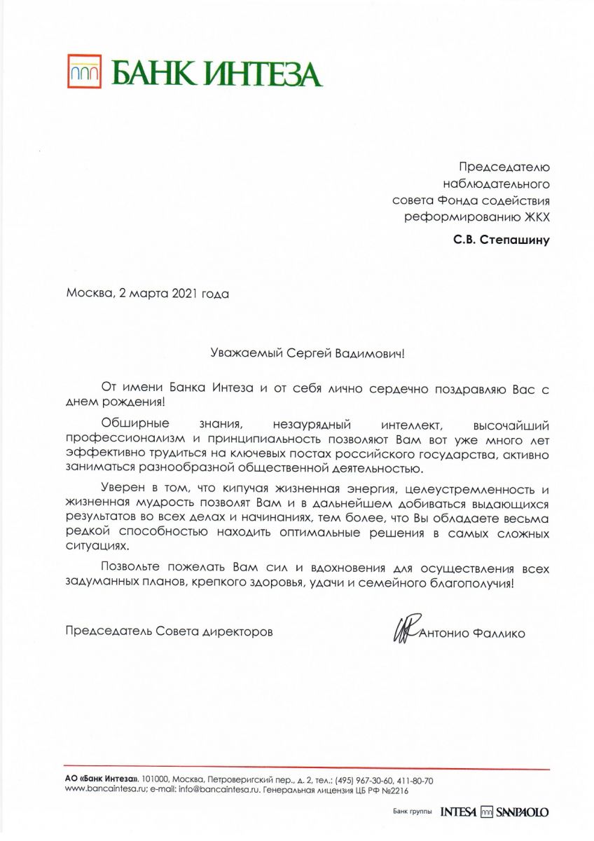 От Председателя Совета директоров «Банк Интеза»