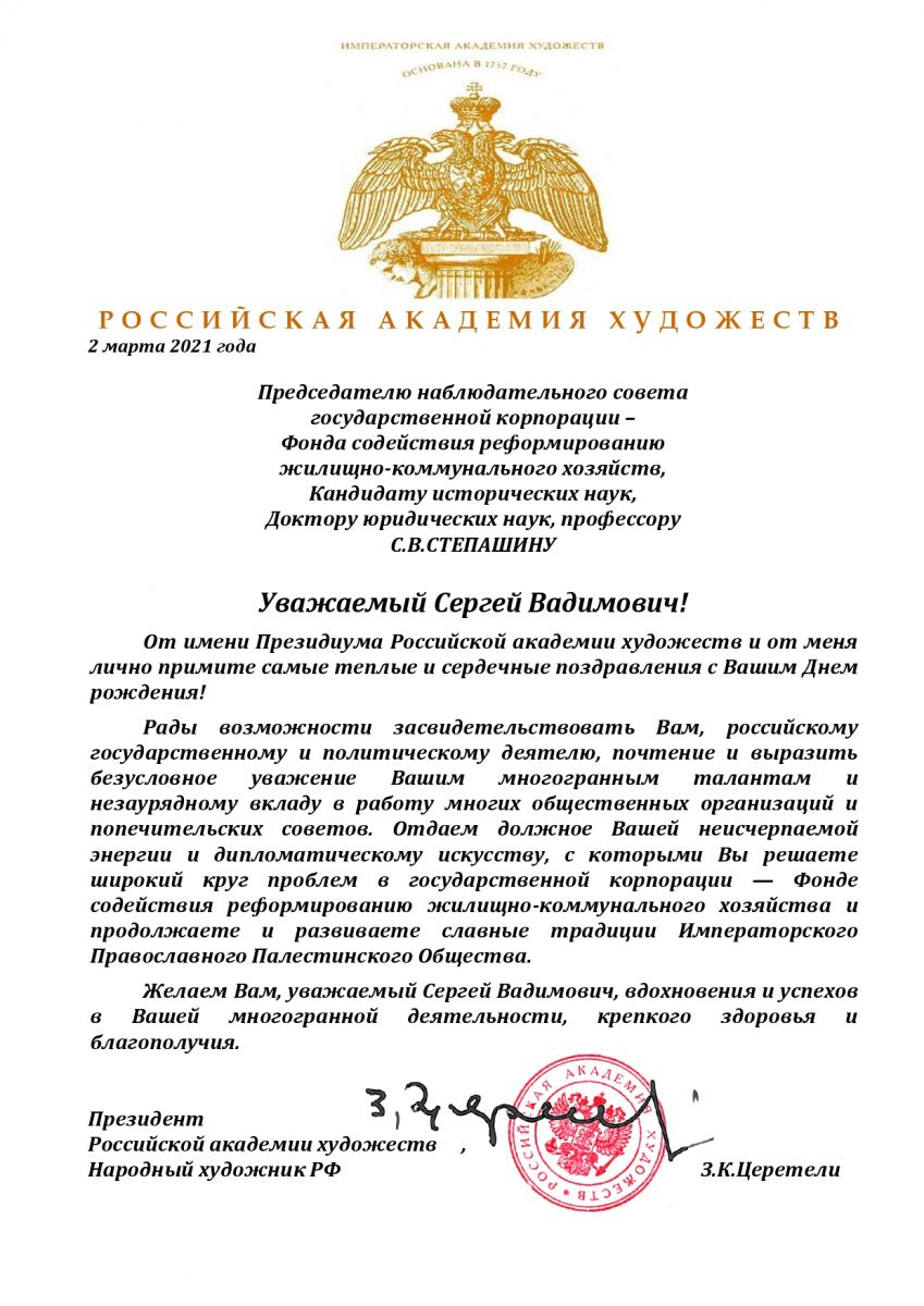От Президента Российской академии художеств