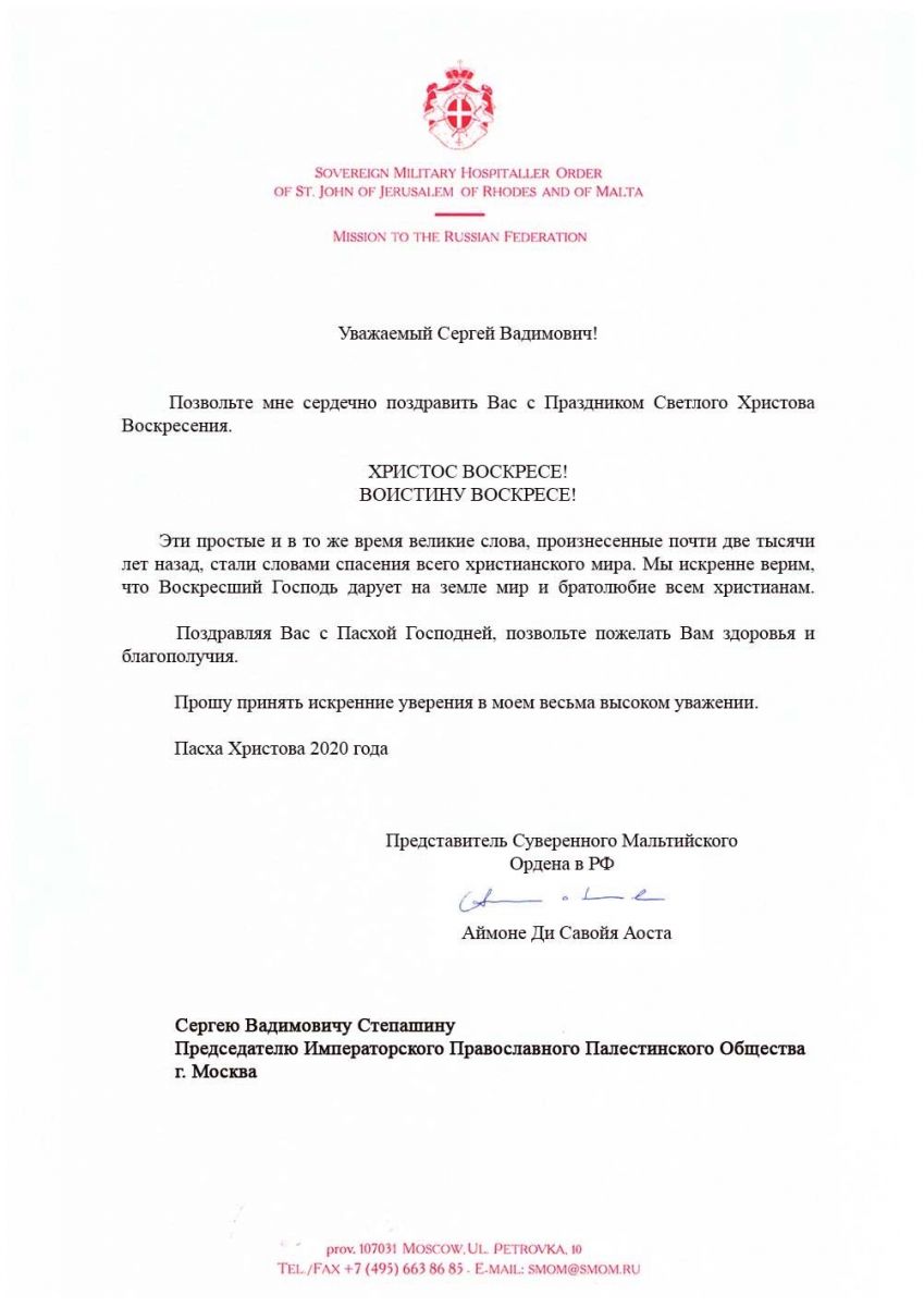 от представителя Суверенного Мальтийского Ордена в РФ Аймоне ди Савойя Аоста