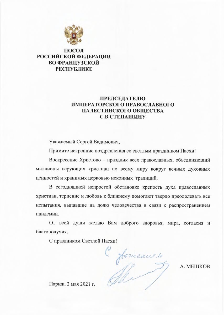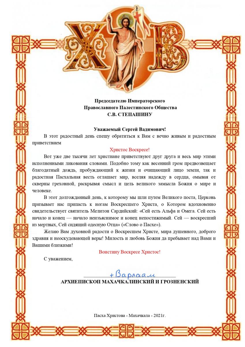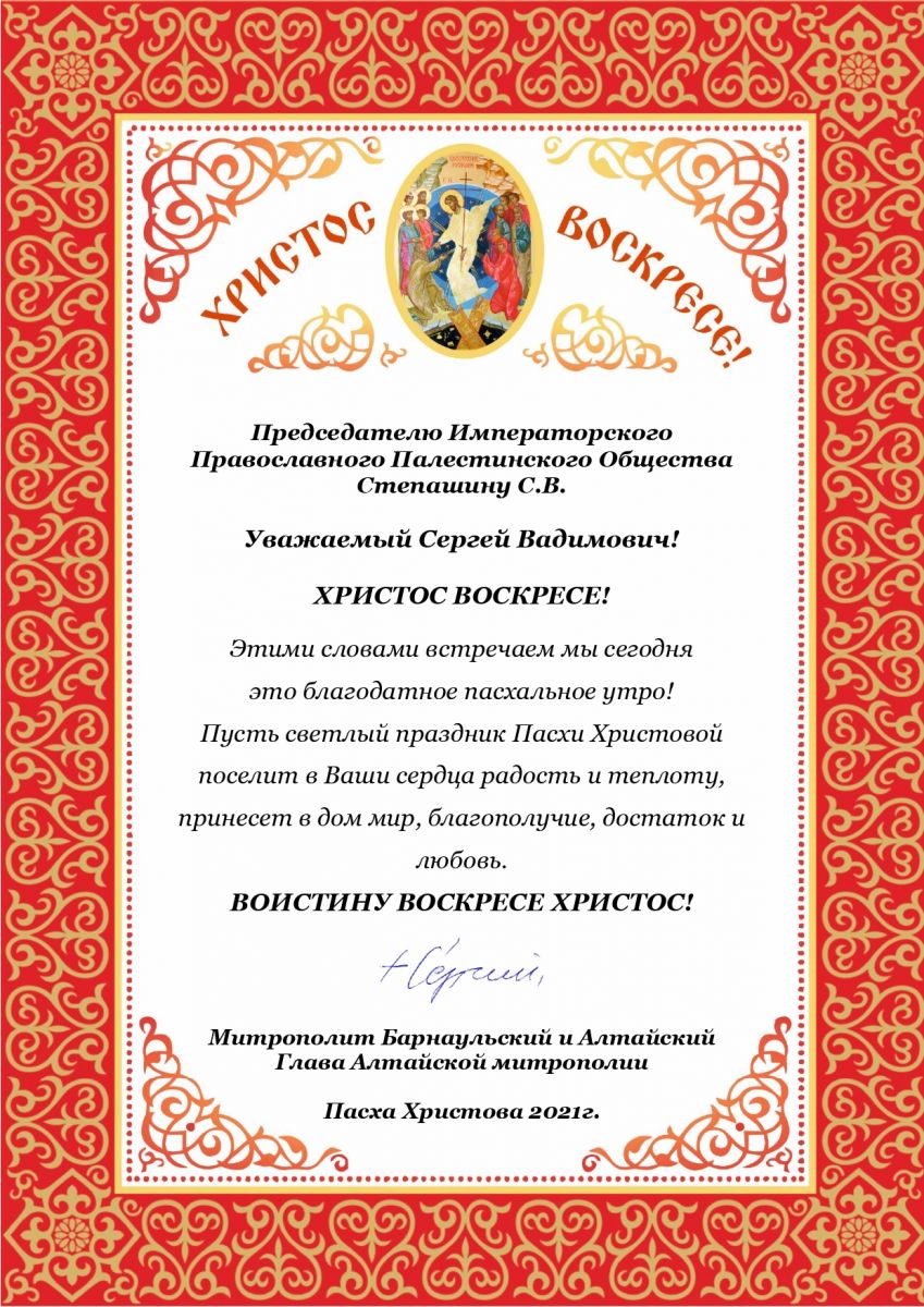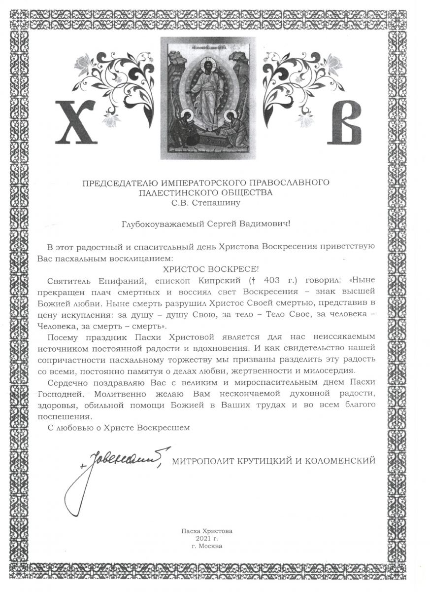 В адрес Председателя Императорского Православного Палестинского Общества Сергея Степашина поступили ряд поздравлений со Святой Пасхой: