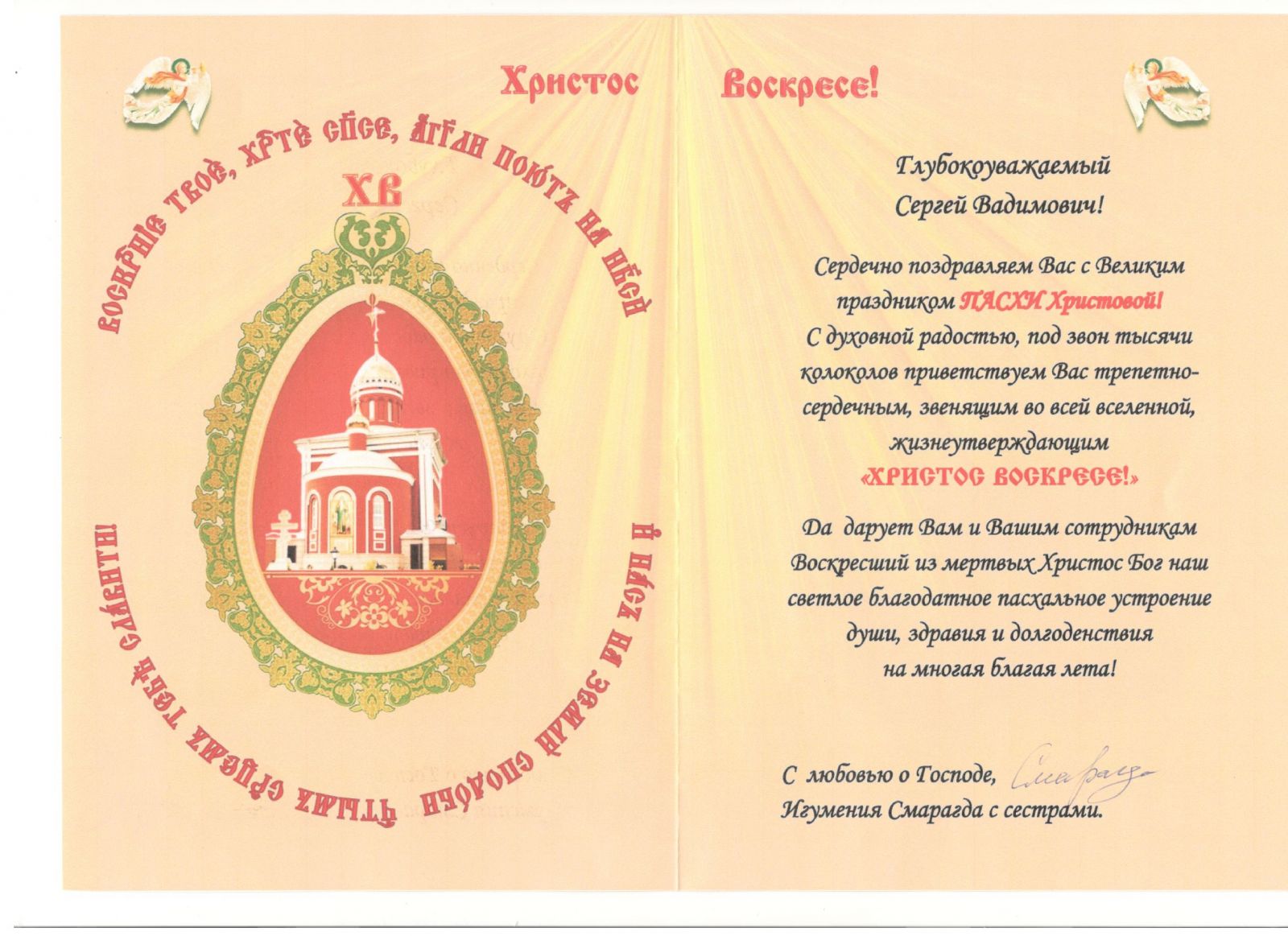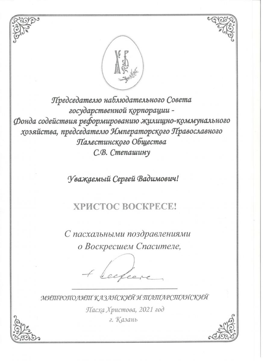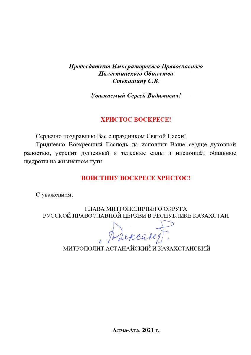 В адрес Председателя Императорского Православного Палестинского Общества Сергея Степашина поступили ряд поздравлений со Святой Пасхой: