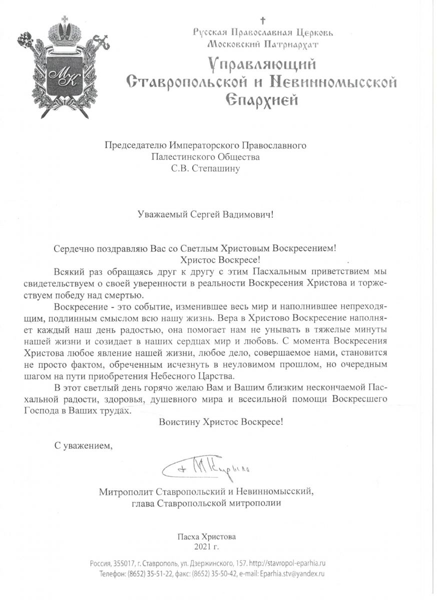 от главы Ставропольской митрополии митрополита Ставропольского и Невиномысского Кирилла