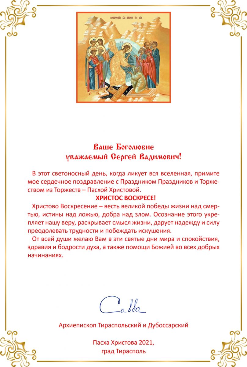 от архиепископа Тираспольского и Дубоссарского Саввы
