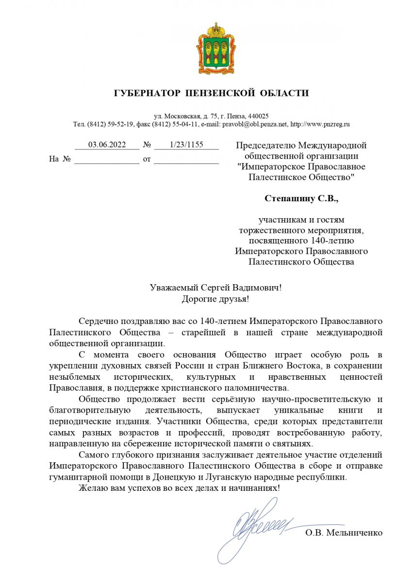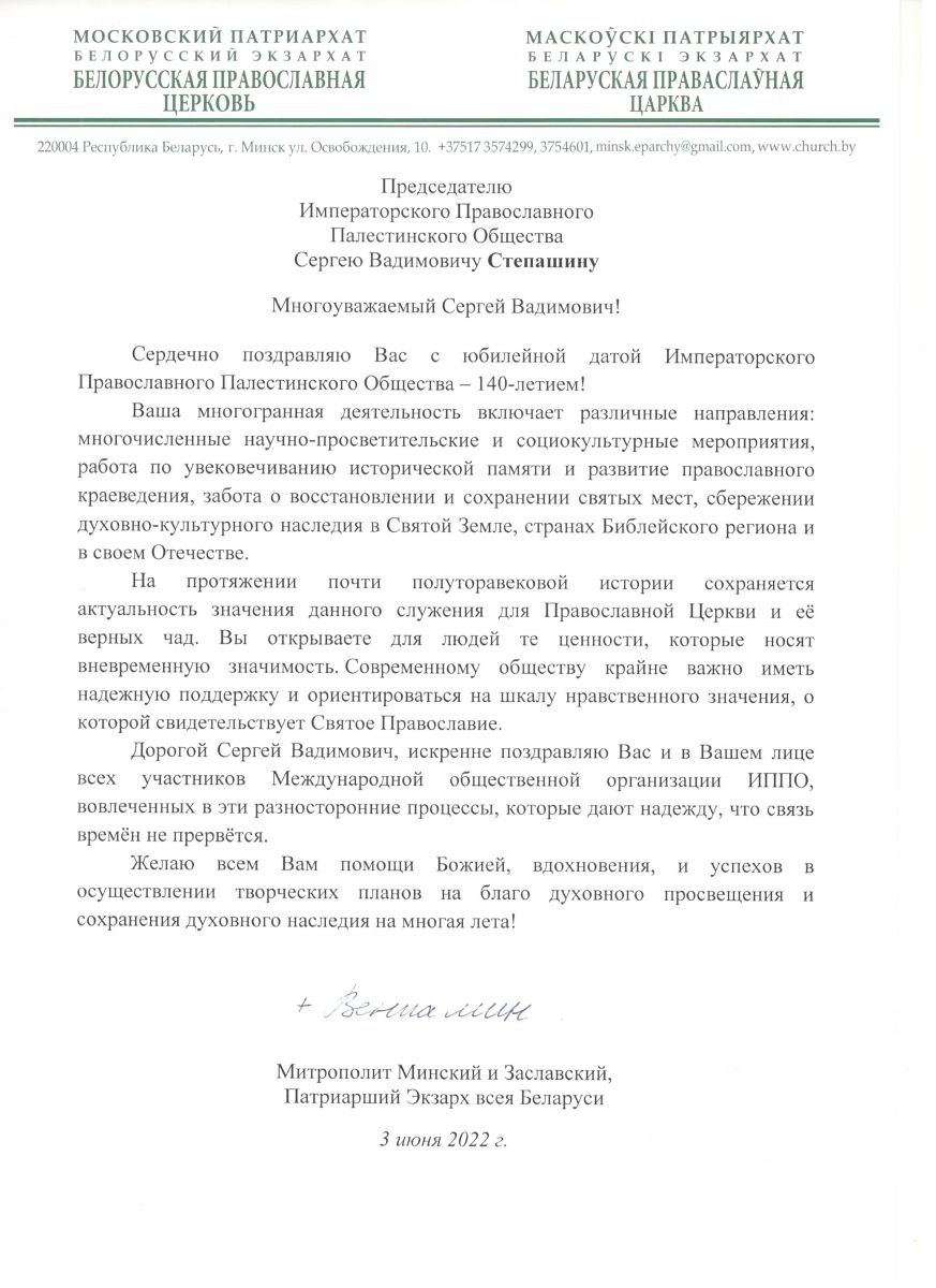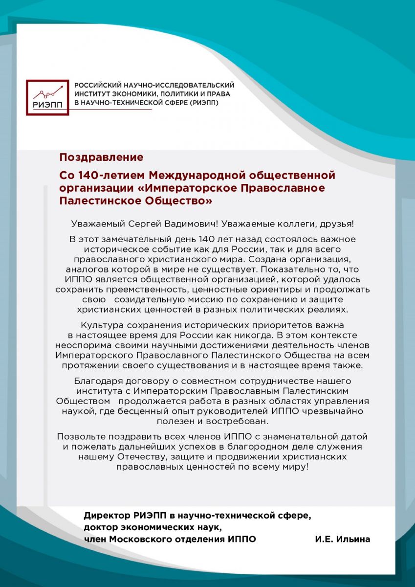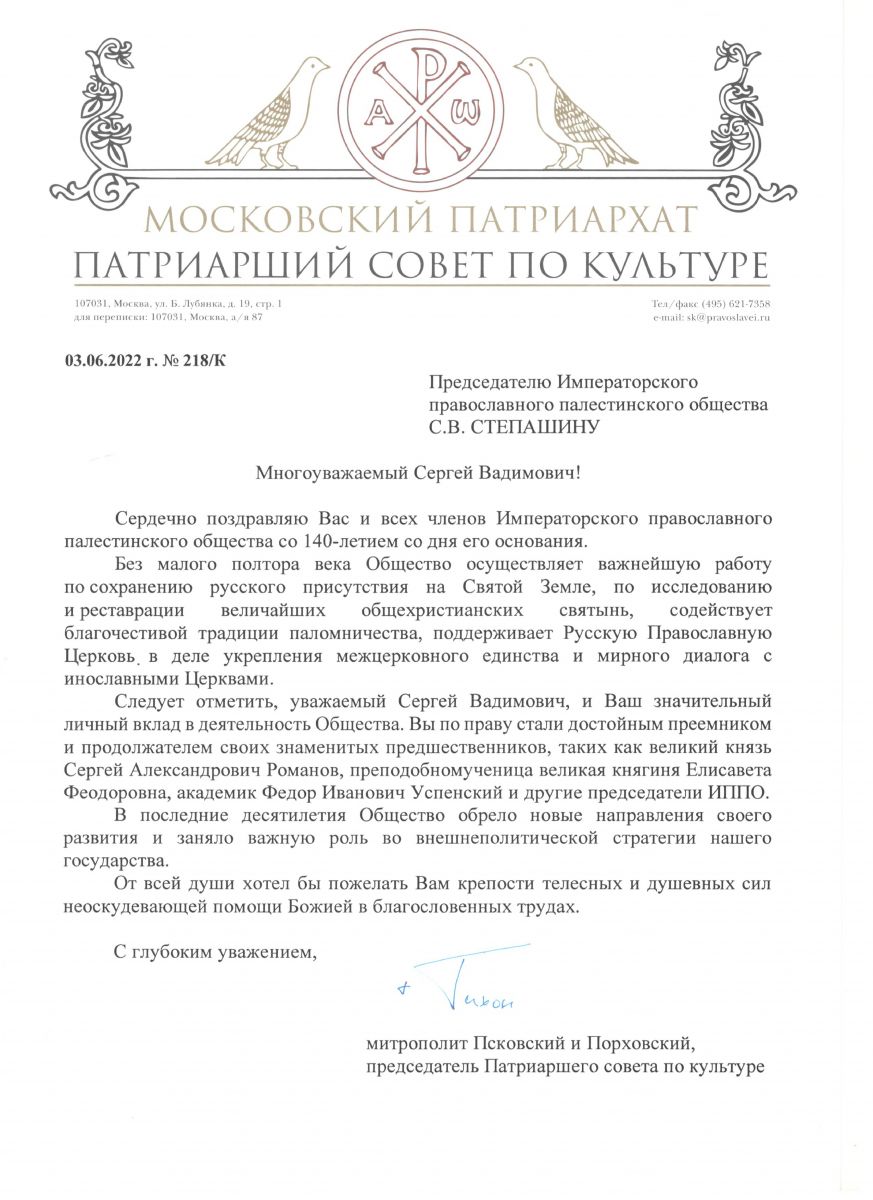 По случаю 140-летия Общества в адрес Председателя ИППО поздравительные письма направили: