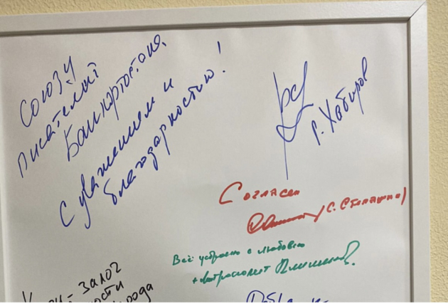 В честь открытия дома Союза писателей гости сделали надписи с пожеланиями успехов творческому сообществу. Отметим, что благодаря решению Правительства Башкортостана здание передано Союзу в постоянное пользование.