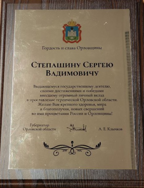Председатель ИППО Сергей Степашин награжден знаком «Гордость и слава Орловщины»