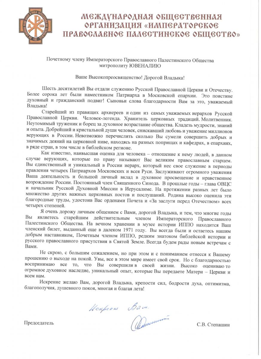 Письмо в адрес старейшего действительного члена ИППО митрополита Ювеналия направил Председатель Императорского Православного Палестинского Общества Сергей Степашин.