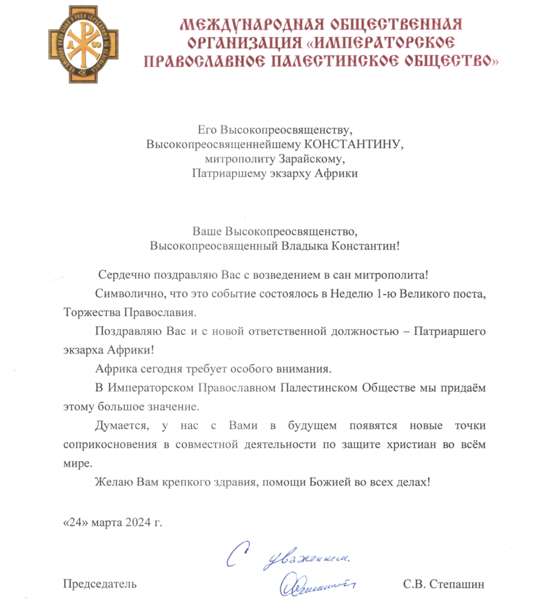 Председатель ИППО Сергей Степашин направил поздравительное письмо в адрес Патриаршего экзарха Африки митрополита Зарайского Константина
