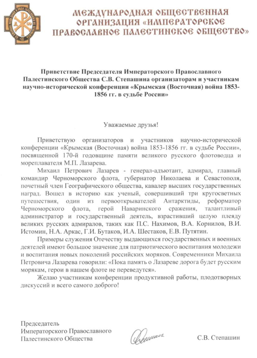 Приветственное слово в адрес участников и организаторов конференции направил Председатель Императорского Православного Палестинского Общества Сергей Степашин.