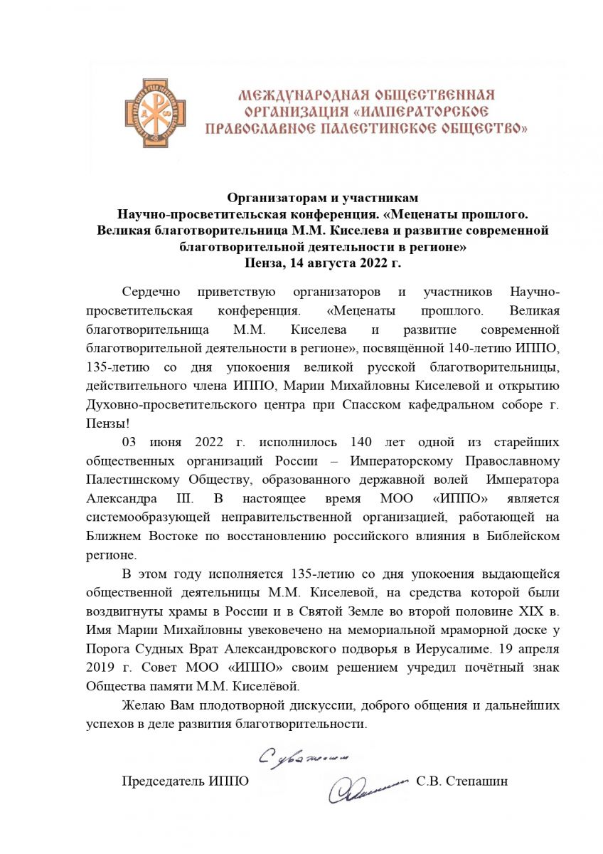 Председатель ИППО Сергей Степашин направил приветствие в адрес организаторов и участников Научно-просветительской конференции «Меценаты прошлого. Великая благотворительница М.М. Киселева и развитие современной благотворительной деятельности в регионе»