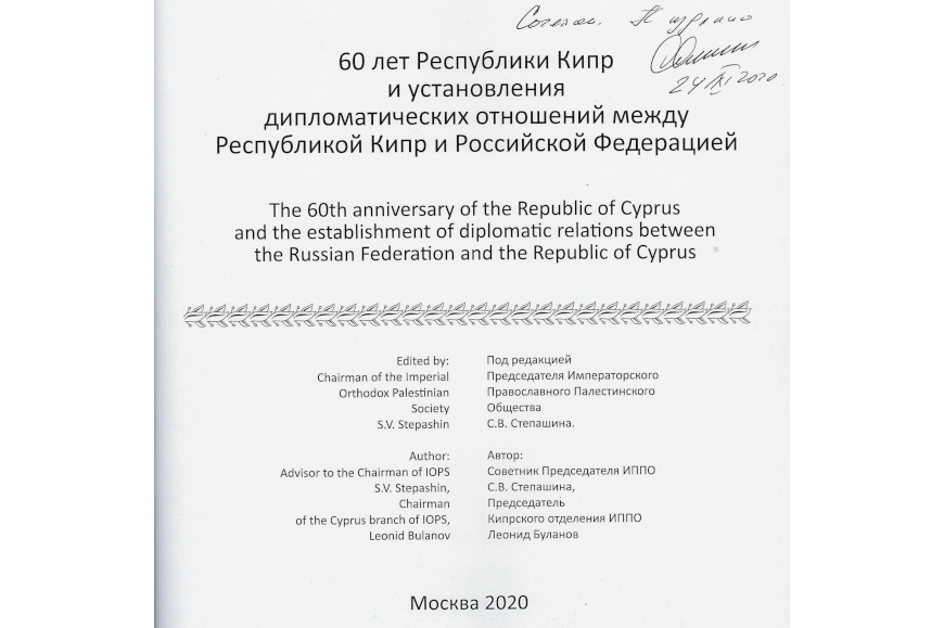 Книга "60 лет Республике Кипр и установлению дипломатических отношений" вышла под редакцией Председателя ИППО Сергея Степашина, автор книги - руководитель Кипрского отделения ИППО Леонид Буланов. Книгу открывают вступительные слова Министра иностранных дел РФ Сергея Лаврова и Председателя ИППО Сергея Степашина.