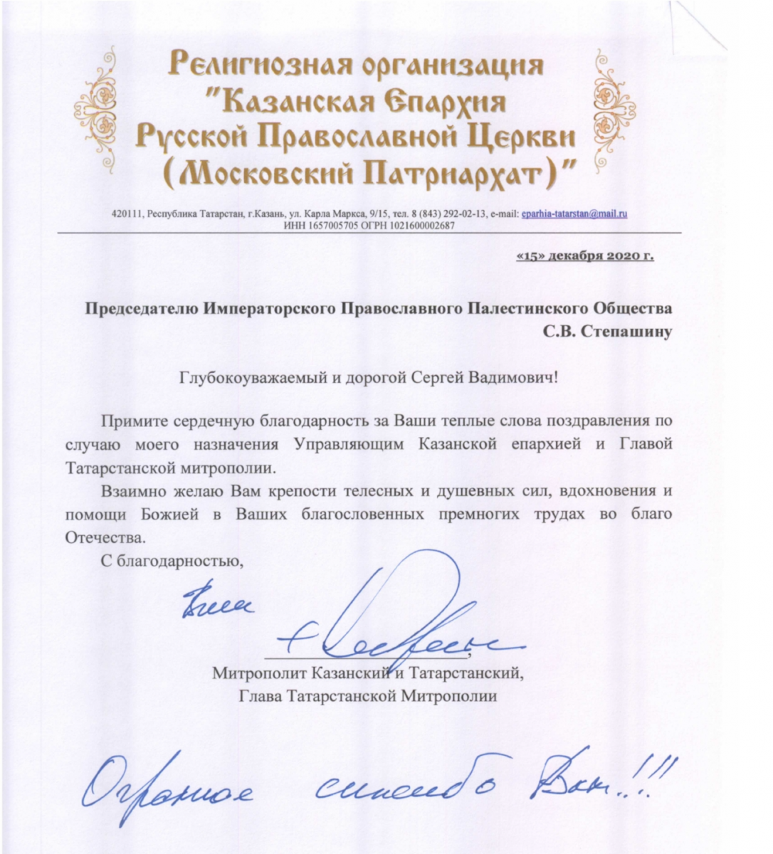 Глава Татарстанской митрополии митрополит Казанский и Татарстанский Кирилл направил благодарственное письмо в адрес Председателя Императорского Православного Палестинского Общества Сергея Степашина.