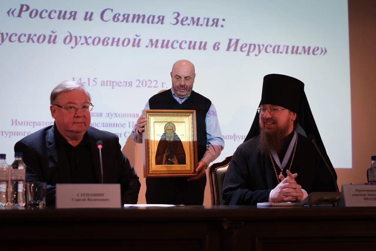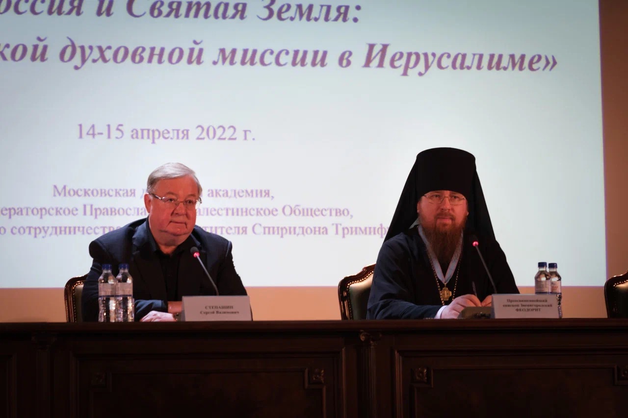 В рамках доклада на пленарном заседании конференции Сергей Степашин рассказал об истории и роли Императорского Православного Палестинского Общества в присутствии России в ближневосточном регионе. Одним из важнейших уставных направлений деятельности ИППО с самого начала была и остаётся научная работа в области исторического, археологического, филологического исследований Святой Земли и других стран Библейского региона. Традиционно Общество оказывает помощь православным паломникам, прибывающим на Святую Землю, и занимается гуманитарной Миссией, к которой относится открытие школ, больниц и странноприимных домов. По завершении пленарного заседания Сергей Вадимович вручил владыке ректору икону небесного покровителя Академии преподобного Сергия Радонежского.