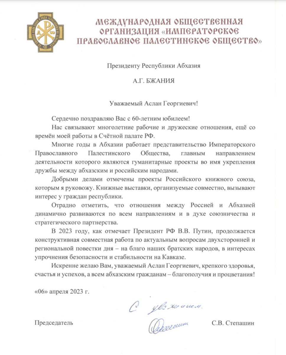Поздравление в адрес главы Абхазии по случаю 60-летнего юбилея направил Председатель ИППО Сергей Степашин: