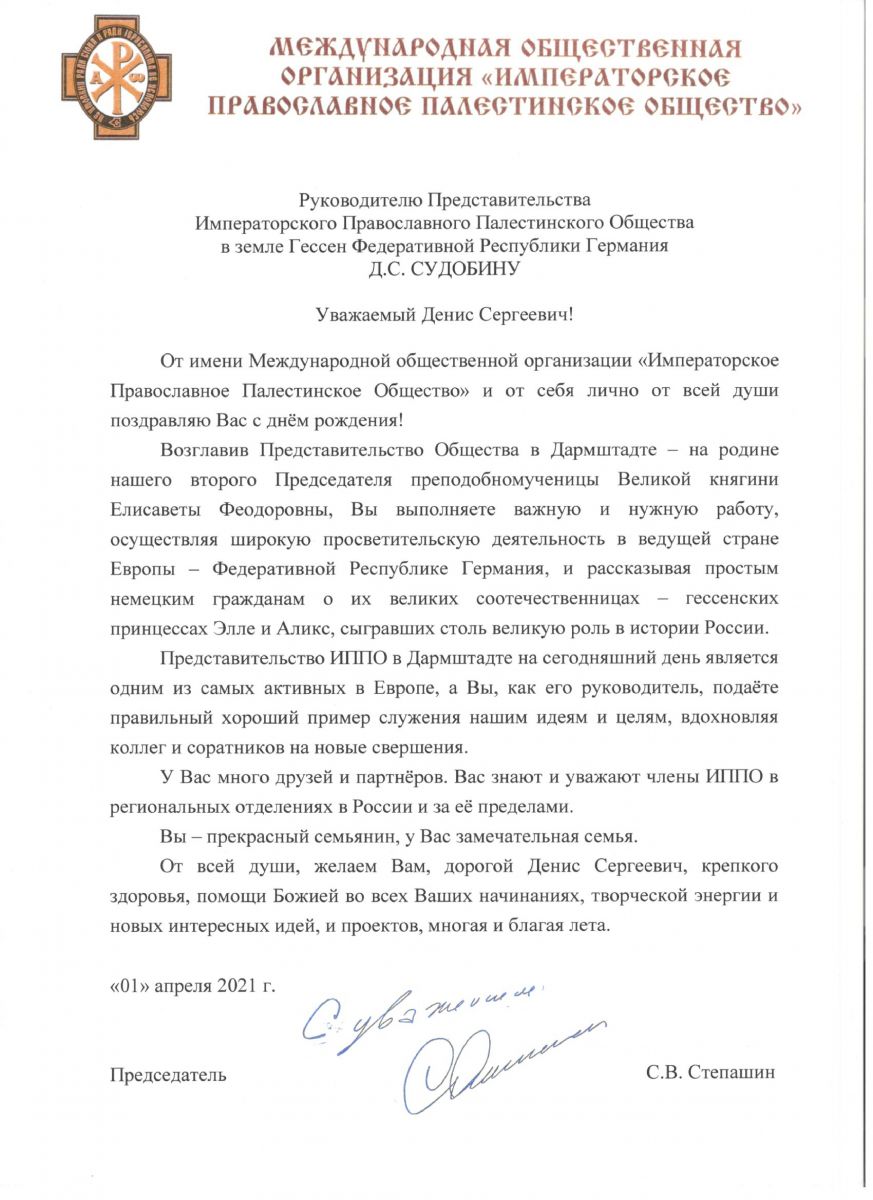 Поздравление в адрес Дениса Сергеевича направил Председатель Императорского Православного Палестинского Общества Сергей Степашин.