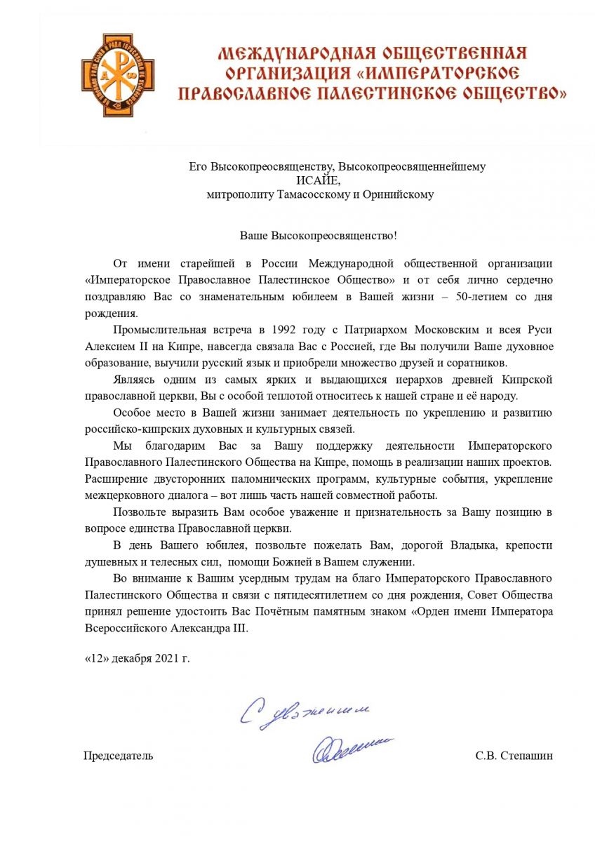 Поздравление по случаю 50-летнего юбилея в адрес Владыки направил Председатель Императорского Православного Палестинского Общества Сергей Степашин.