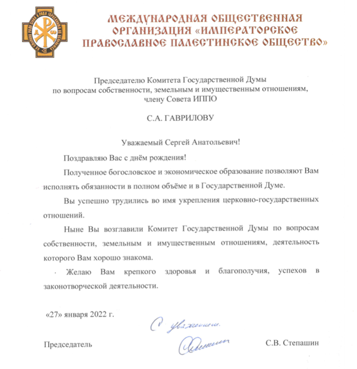 27 января 2022 года день рождения отмечает председатель Комитета Государственной Думы по вопросам собственности, земельным и имущественным отношениям, член Совета Общества Сергей Гаврилов.